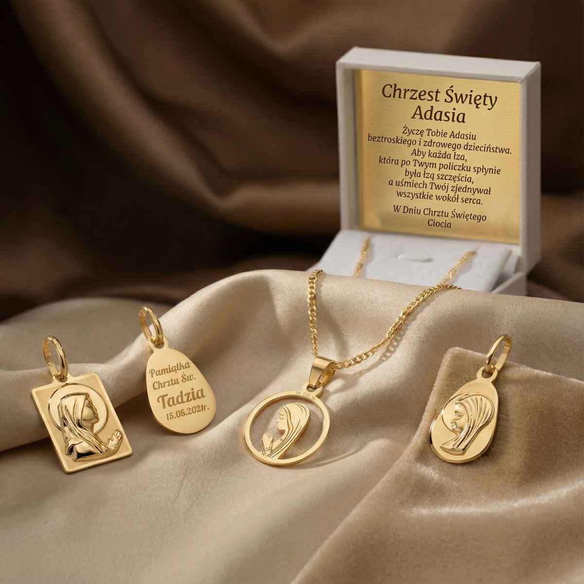 Jednym z najbardziej klasycznych, ale też oryginalnych i ponadczasowych upominków na ważne okazje w życiu dziecka jest złoty medalik. To najpopularniejszy i najbardziej ceniony podarunek, który można spersonalizować dedykowanym nadrukiem (np. imieniem dziecka) z okazji Chrztu św. malucha lub I Komunii Świętej i bierzmowania starszych dzieci. W asortymencie internetowego sklepu Alechrzest.pl nie mogło więc zabraknąć szerokiej oferty medalików ze złota. Jest to wyjątkowa biżuteria dla dzieci o religijnym i symbolicznym charakterze a także personalizowany prezent dla dziecka. Proponujemy medaliki odpowiednie dla chłopców i dla dziewczynek, a przede wszystkim złote medaliki z grawerem, które będą najlepszą pamiątka chrztu świętego.