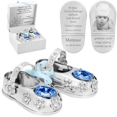 Proponujemy Państwu śliczne posrebrzane baletki z kryształami oraz indywidualnym grawerunkiem. Piękna i niezapomniana pamiątka z okazji chrztu, roczku. W cenę wchodzi grawerunek na podeszwach obu bucików zrobiony metodą diamentową. Zdjęcie na bucikach wykonane metodą grawerunku, takowy sposób personalizacji charakteryzuje się wyryciem na przedmiocie zdjęcia bądź tekstu. Należy zauważyć, że w przypadku tego sposobu personalizacji nie można oczekiwać identycznego odwzorowania obiektu z podglądowego zdjęcia. Buciki posiadają małe białe kryształy po boku oraz po jednym dużym niebieskim. Dodatkowo buciki są związane niebieską wstążką.
