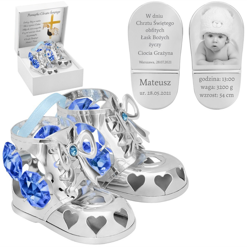 Proponujemy Państwu śliczne pozłacane baletki z kryształami oraz indywidualnym grawerunkiem. Piękna i niezapomniana pamiątka z okazji chrztu, roczku. W cenę wchodzi grawerunek na podeszwach obu bucików zrobiony metodą diamentową. Zdjęcie na bucikach wykonane metodą grawerunku, takowy sposób personalizacji charakteryzuje się wyryciem na przedmiocie zdjęcia bądź tekstu. Należy zauważyć, że w przypadku tego sposobu personalizacji nie można oczekiwać identycznego odwzorowania obiektu z podglądowego zdjęcia. Buciki posiadają małe białe kryształy po boku oraz po jednym dużym różowy. Dodatkowo buciki są związane różową wstążką.