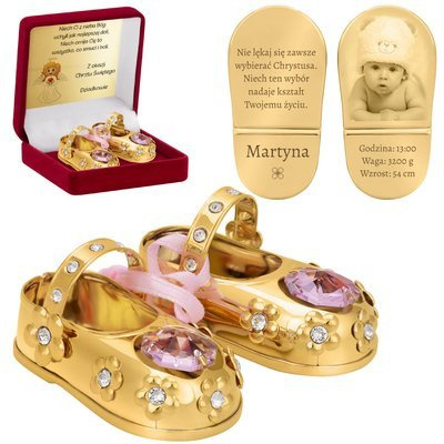 Oferujemy wyjątkowe buciki platerowane 24-karatowym złotem, ozdobione kryształami oraz personalizowanym grawerem. To doskonały sposób, by uczcić najważniejsze momenty w życiu dziecka – chrzciny, pierwsze urodziny czy inne wyjątkowe okazje.