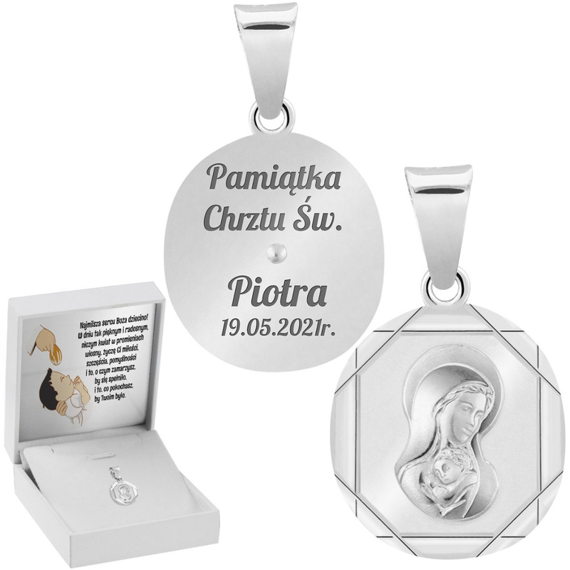 Chrzest lub Komunia: srebrny medalik 925 Matka Boska z graweremCena: 89,00 zł / szt.