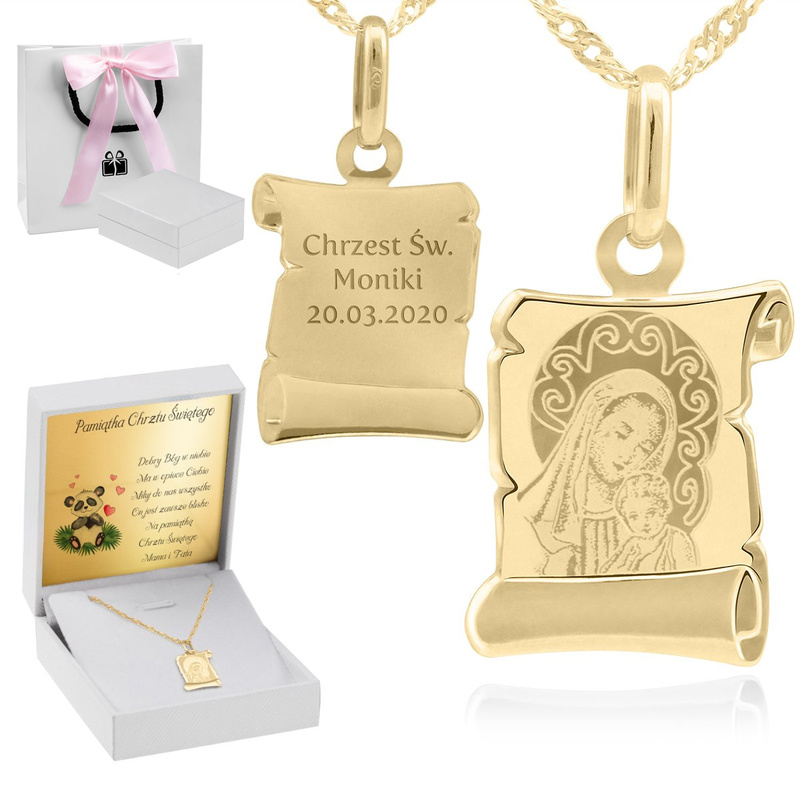 Złoty medalik z grawerem to propozycja dla osób, które chcą wręczyć biżuterię o religijnej symbolice w gotowej oprawie. W komplecie otrzymujesz nie tylko medalik z wizerunkiem Matki Boskiej z Dzieciątkiem i łańcuszek, ale też ozdobne pudełeczko z różową wstążką. Dzięki temu łatwo przygotować spójny upominek na ważny dzień bez dobierania dodatków osobno. Do zestawu dołączona jest również ozdobna tabliczka z dedykacją, zdjęciem bądź grafiką, a jeśli wolisz, możesz skorzystać z dostępnych projektów. Całość wykonano ze złota próby 585, co podkreśla rangę okazji i trwały charakter pamiątki. Taki komplet sprawdzi się na Chrzest, I Komunię lub bierzmowanie, gdy liczy się czytelny przekaz i osobisty detal. Grawerunek umieszczony na rewersie medalika pozwala dodać imię oraz datę i nadać prezentowi indywidualny sens.