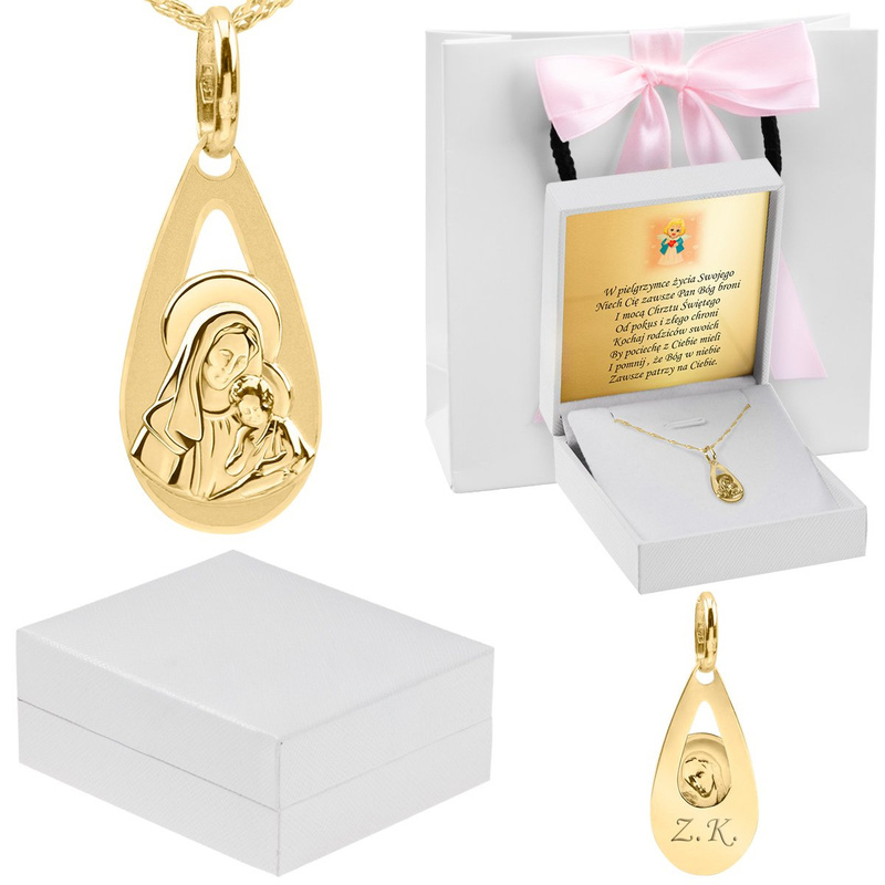 - złoty medalik w kształcie łzy z wizerunkiem Matki Boskiej