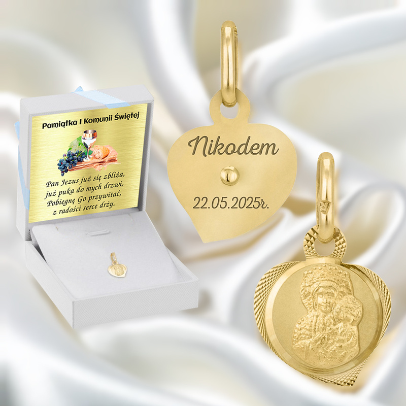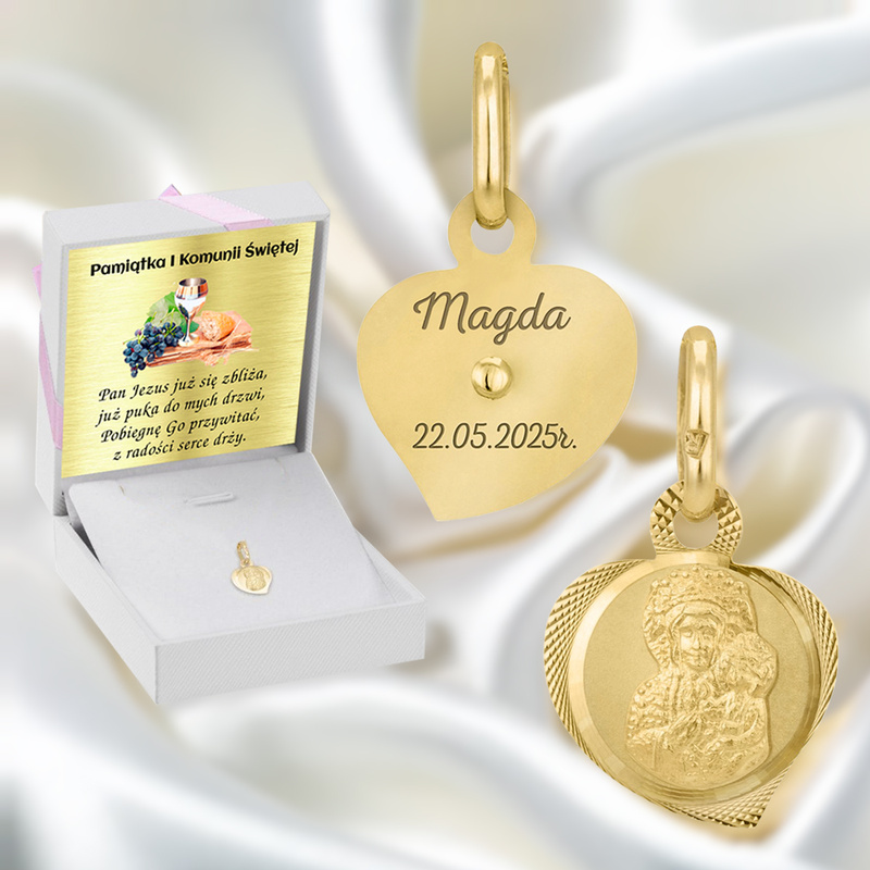 To propozycja dla osób, które chcą połączyć klasyczny motyw religijny z osobistym dopowiedzeniem w formie graweru. Medalik wykonano w całości ze złota, a serce z ozdobnym szlifem nadaje mu delikatny, ale wyrazisty wygląd. Wypukły wizerunek Matki Boskiej Częstochowskiej dobrze prezentuje się zarówno w codziennym noszeniu, jak i w dniu uroczystości. Dzięki niewielkiej formie medalik naturalnie pasuje dziecku, a jednocześnie zachowuje uniwersalny charakter.