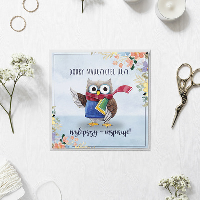 Podaruj swojemu nauczycielowi lub wychowawcy zabawną kartkę z okazji Dnia Nauczyciela lub zakończenia roku szkolnego. Kartka dla nauczyciela z życzeniami, będzie miłą pamiątką od całej klasy lub pojedynczego ucznia. Kartka jest zaprojektowana w humorystycznym stylu. Przedstawia sympatyczną, rysunkową sowę, która jak powszechnie wiadomo jest symbolem mądrości i wiedzy. Opatrzona została inspirującym hasłem. W środku znajduje się krótki wierszyk i miejsce do ręcznego wypisania życzeń.