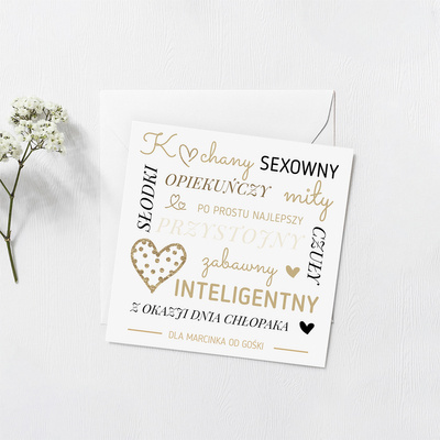 Jeżeli trudno Ci odpowiedzieć na to pytanie jednym słowem, nie musisz się ograniczać! Wiadomo, że jest najlepszy, ale możesz wymienić wszystkie jego najwspanialsze cechy, na kartce z okazji Dnia Chłopaka! Taka kartka na pewno uświadomi mu, jaki jest dla Ciebie ważny i wyjątkowy! Spraw mu radość, niech poczuje się doceniony!