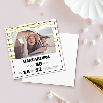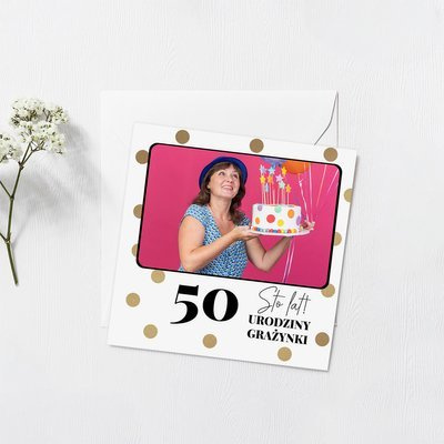Jeżeli szukasz wyjątkowego dodatku do prezentu urodzinowego - właśnie go znalazłeś! Personalizowana kartka na urodziny, to dobry pomysł, bez względu na wiek! Jeżeli posiadasz ciekawe zdjęcie z solenizantem/ką, śmiało możesz rozpocząć tworzenie! Uroku kartce dodają złote groszki.