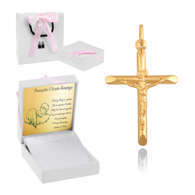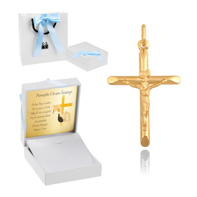 Proponujemy państwu wyjątkowy krzyżyk, który świetnie sprawdzi się na chrzest, komunię, czy bierzmowanie. Nowoczesna forma krzyżyka z wizerunkiem Chrystusa sprawia, że zawieszka jest wyjątkową ozdobą, która wyróżni się na tle pozostałych. Delikatna budowa krzyżyka świetnie dopasuje się do cienkiego łańcuszka. Krzyżyk został wykonany ze złota próby 585. Próba złota została potwierdzona cechą urzędu probierczego, dzięki czemu mają państwo pewność wysokiej jakości użytych do produkcji materiałów.