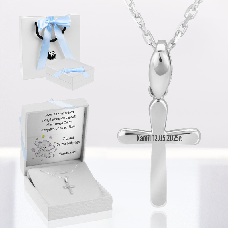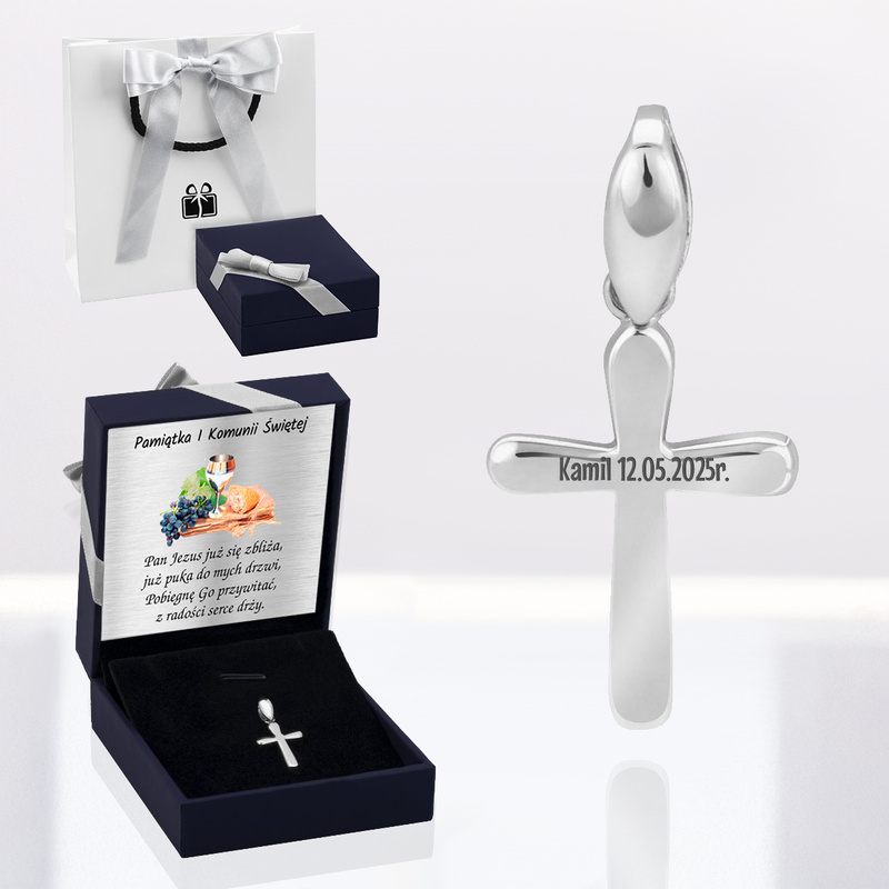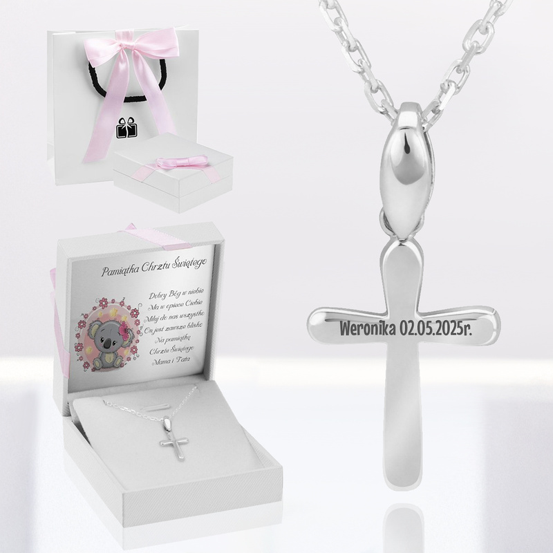 - grawerunek na rewersie krzyżyka np. krótkie imię i data, maksymalnie 20 znaków (łącznie ze spacjami)