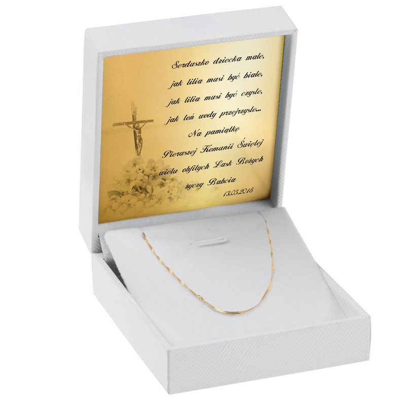 Subtelny łańcuszek, wykonany z najwyższej jakości złota próby 585. Świadczą o tym dołączone metki jubilerskie oraz wybita na łańcuszku próba, zbadana przez Polski Urząd Probierczy. Łańcuszek przez oryginalny splot pięknie pasuję do każdej zawieszki/wisiorka bądź medalik. Upominek doskonały na wszelkiego rodzaju ważne okoliczności takie jak urodziny, Chrzciny czy I Komunia Święta.