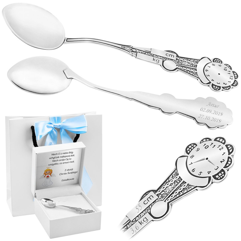 Personalizacja obejmuje grawer na łyżeczce z limitem maksymalnie 100 znaków, wykonywany techniką diamentową. W cenę wliczone jest także umieszczenie godziny na tarczy zegara oraz danych takich jak waga i wzrost. Najczęściej wybierane są informacje o dziecku, takie jak imię, data i godzina urodzenia, wzrost, waga oraz data chrztu. Do zestawu dołączona jest tabliczka z Twoją dedykacją, dzięki czemu możesz dodać osobną wiadomość. Treść do grawerowania na łyżeczce oraz kolor etui podaj w komentarzu do zamówienia.