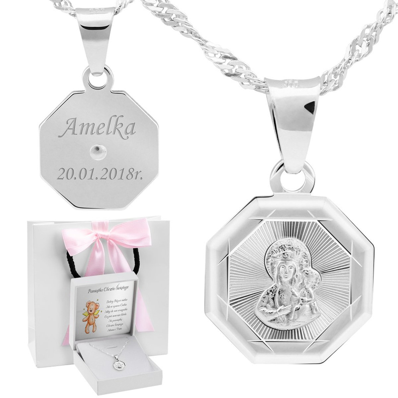 - Srebrny medalik z łańcuszkiem stanowi spójny komplet na ważną uroczystość
