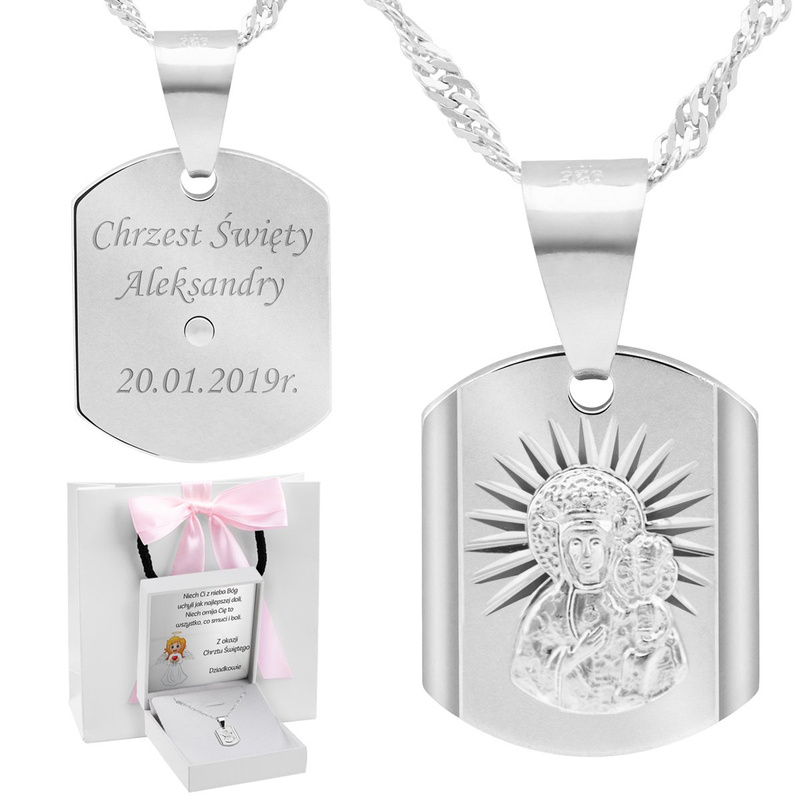 Jeżeli chcesz podarować srebrny medalik z grawerem, który zachowuje klasyczny wizerunek Matki Boskiej Częstochowskiej, ten komplet porządkuje wszystko w jednej propozycji. Otrzymujesz medalik wykonany ręcznie i wykończony metodą diamentowania, do tego łańcuszek oraz oprawę z różową wstążką i dedykacją. Grawer na rewersie oraz tabliczka z dowolną dedykacją pomagają nadać pamiątce osobisty charakter, który dobrze pasuje do ważnych uroczystości rodzinnych.