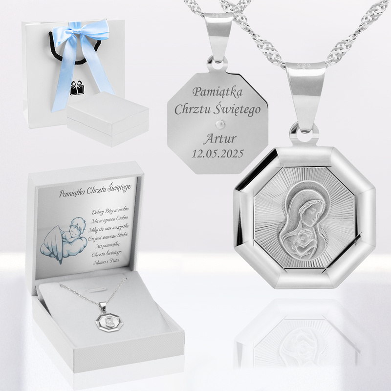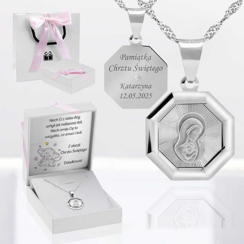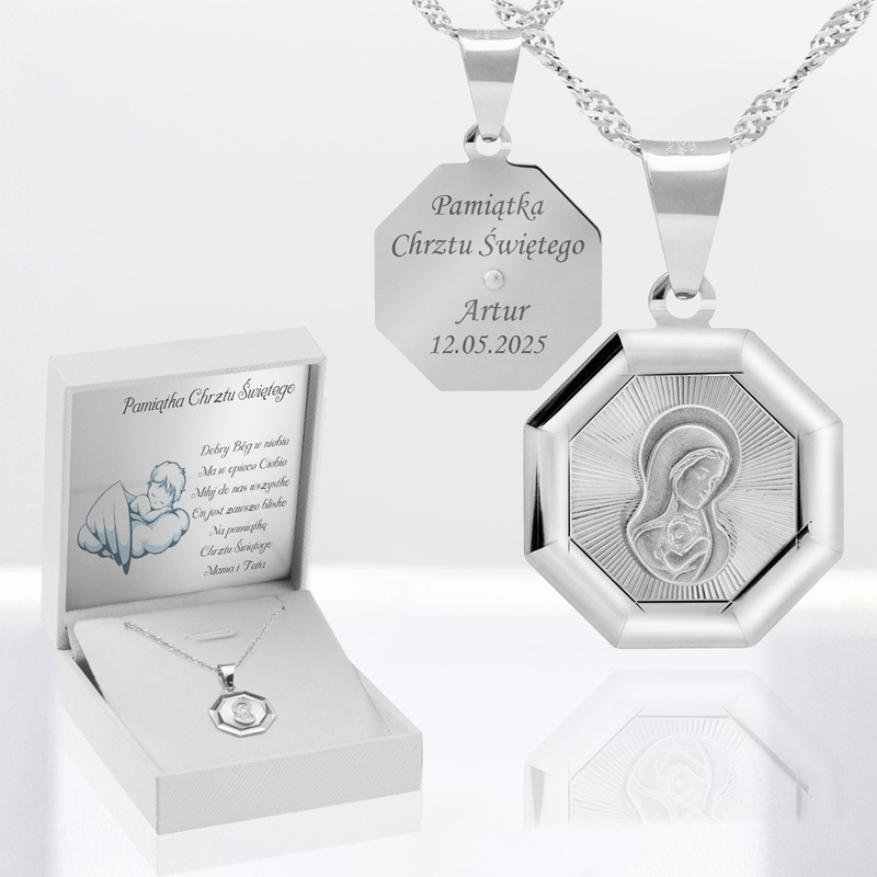 To propozycja, która łączy motyw Matki Boskiej z dopracowanym wykończeniem i możliwością nadania osobistego znaczenia. Szlifowane detale przyciągają wzrok w świetle, a forma 8-kąta nadaje medalowi charakteru bez przesady. Grawer na odwrocie pozwala zostawić słowa ważne dla dziecka i rodziny, a dedykacja w opakowaniu domyka całość w spójną historię.