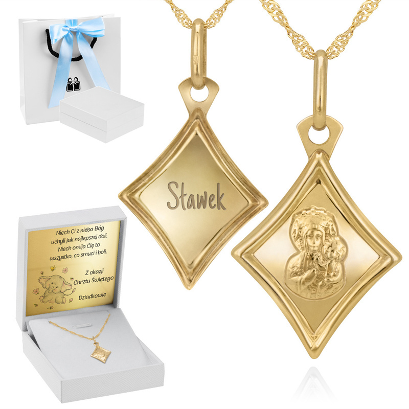 Medalik w kształcie rombu z wizerunkiem Matki Boskiej Częstochowskiej, wykonany z najwyższej jakości złota próby 585. Drobiazg towarzyszący Ci każdego dnia. Doskonale stworzona biżuteria, która sprawdzi się jako piękny upominek na wszelkiego rodzaju okoliczności takie jak: Urodziny, Imieniny, Bierzmowanie, Komunia, Święta oraz jako bez okazyjny prezent, który przyniesie radość osobie obdarowanej.