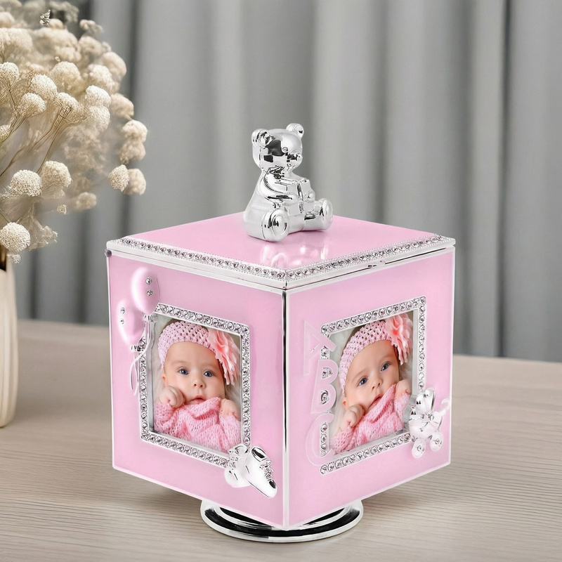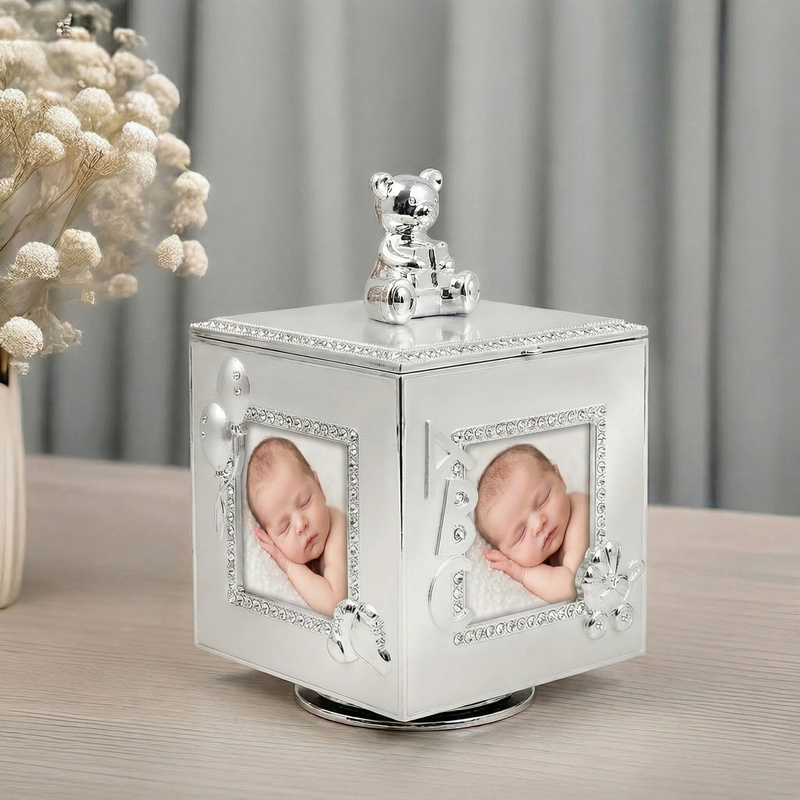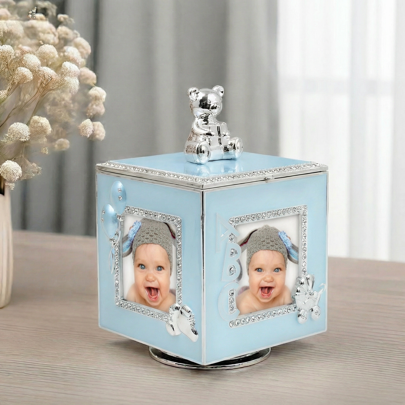 Karuzela szkatułka z pozytywką na 4 zdjęcia to sposób, by połączyć wspomnienia z codzienną dekoracją w jednym przedmiocie. Błękitna forma przyciąga wzrok, a posrebrzana stal dodaje całości eleganckiego blasku. W środku przewidziano miejsce na fotografie, dzięki czemu możesz ułożyć małą historię z ważnych chwil. To propozycja, która dobrze sprawdza się jako upominek na chrzest, roczek oraz kolejne urodziny. Dodatkową wartością jest indywidualna dedykacja, która nadaje całości osobisty charakter. Pozytywkę uruchamia się w prosty sposób, co zachęca do sięgania po nią częściej niż tylko od święta. Jeśli szukasz pamiątki, która jest jednocześnie funkcjonalna i ozdobna, ten model spełnia oba te zadania.