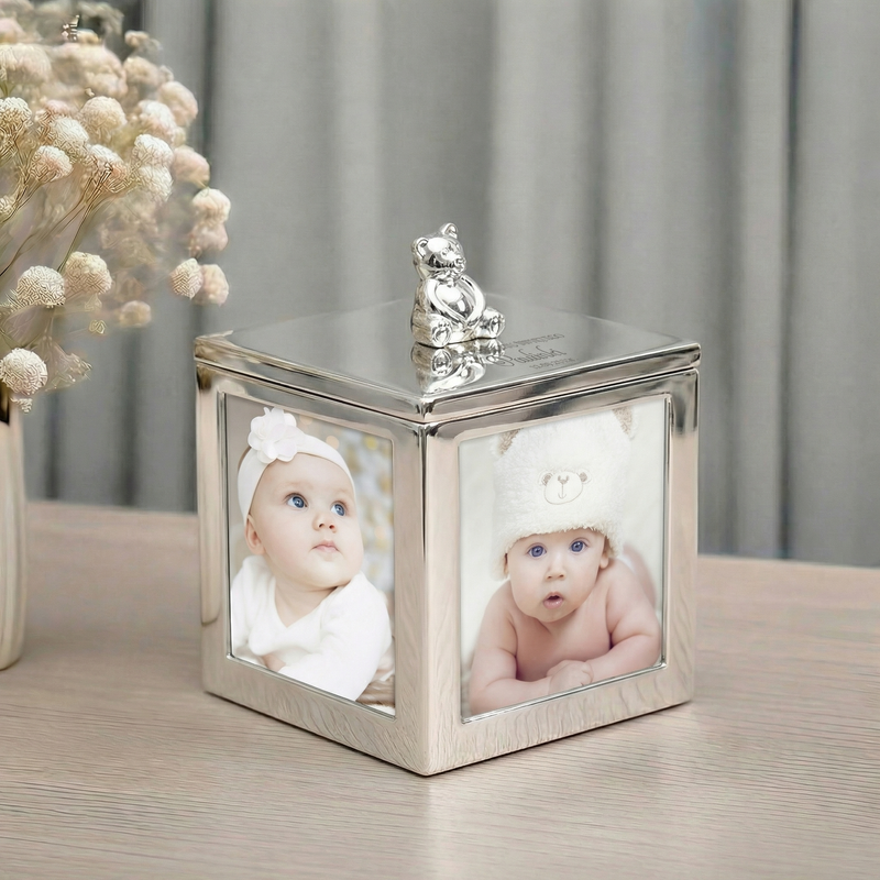 Błękitna kolorystyka dobrze wygląda w dziecięcym pokoju, na komodzie w salonie albo na półce w sypialni, gdzie lubisz mieć pod ręką rodzinne akcenty. Cztery fotografie tworzą efekt galerii, która od razu budzi skojarzenia z ważnymi chwilami. Posrebrzana powierzchnia odbija światło, więc pamiątka naturalnie zwraca uwagę i pasuje do różnych aranżacji. To także dobry wybór, gdy chcesz wręczyć prezent, który po rozpakowaniu od razu może stać się elementem wystroju.