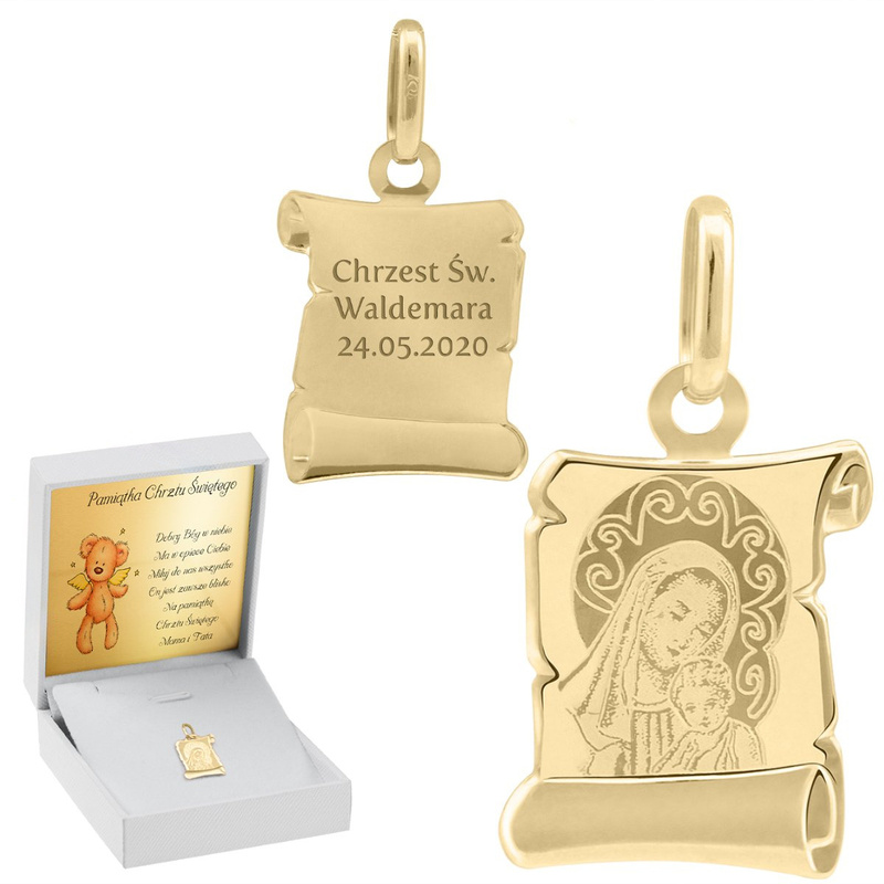 • Medalik ze złota pr. 585 z Matką Boską i Dzieciątkiem, grawer na rewersie oraz białe pudełeczko z tabliczką