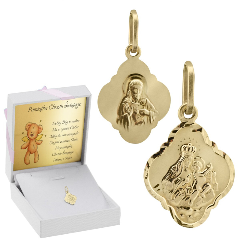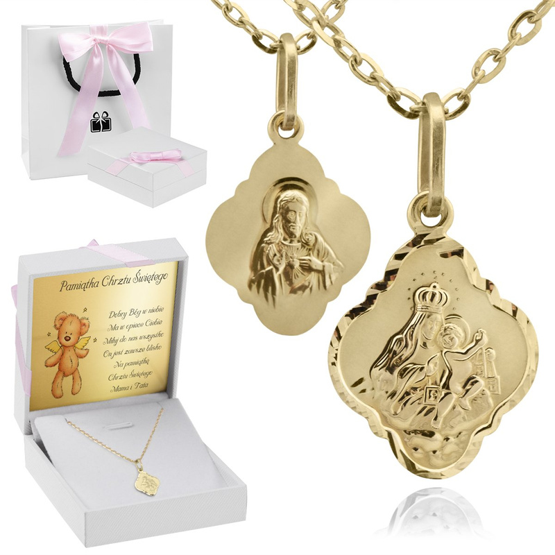 Różowa wstążka na eleganckim pudełku od razu sugeruje, że komplet jest gotowy do wręczenia podczas uroczystości. Ten złoty medalik z łańcuszkiem 585 został przygotowany jako upominek na chrzest lub I Komunię Świętą i podkreśla charakter wydarzenia. Dwustronny motyw pozwala wybrać stronę z Jezusem Chrystusem z jego Najświętszym Sercem albo stronę z wizerunkiem Matki Boskiej z dzieciątkiem. Produkt wykonano ze szlachetnego kruszcu, złota o próbie 585, a na wyrobie wybita została próba złota. Całość została przebadana przez Urząd Probierczy i uzupełniona o metki jubilerskie. W pudełku umieszczona jest tabliczka z dowolną dedykacją, grafiką lub zdjęciem, a w razie potrzeby można też skorzystać z gotowych projektów. W zestawie jest eleganckie pudełko z różową wstążką (z niebieską jest wystawione osobno).