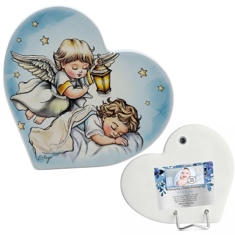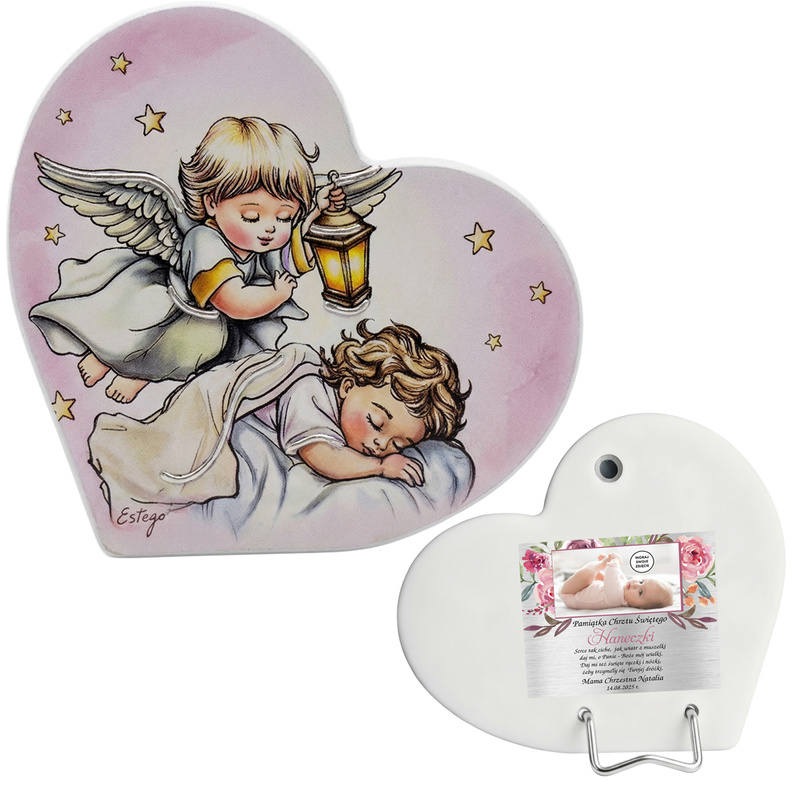 Format 11x10 cm jest idealny do postawienia na komodzie, półce lub w dziecięcym pokoju. To nieduża pamiątka, która ma wielkie znaczenie – przypomina o miłości, opiece i duchowej obecności w codziennym życiu dziecka.