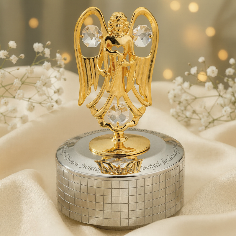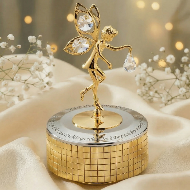 Jeśli zależy Ci na drobnym przedmiocie, który łączy ruch, melodię i osobistą dedykację, ten model spełnia te oczekiwania. Pozytywkę nakręca się od spodu, a obrót wokół własnej osi nadaje jej wyraźny, dekoracyjny efekt podczas grania. Dedykacja na froncie podstawy jest wykonywana laserowo i mieści się w 3 liniach, co ułatwia przygotowanie zwięzłego przekazu. Grawerunek jest wliczony w cenę, więc możesz od razu zamówić wariant gotowy do wręczenia w dołączonym pudełku tekturowym. Wybierz Pozytywka Elf z grawerem, jeśli chcesz połączyć posrebrzane wykończenie z pozłacanym detalem Elfa i konkretną, czytelną personalizacją.