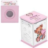 Proponujemy Państwu śliczną posrebrzaną skarbonkę z wypukłą grafiką przedstawiającego misia z różowym serduszkiem. Po bokach również zostały umieszczone obrazki przedstawiające serduszka i literki.