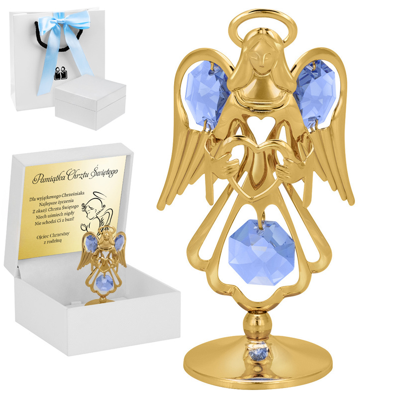 Pozłacana figurka z kryształami / Anioł z sercem / Prezent na chrzest dla dziewczynki