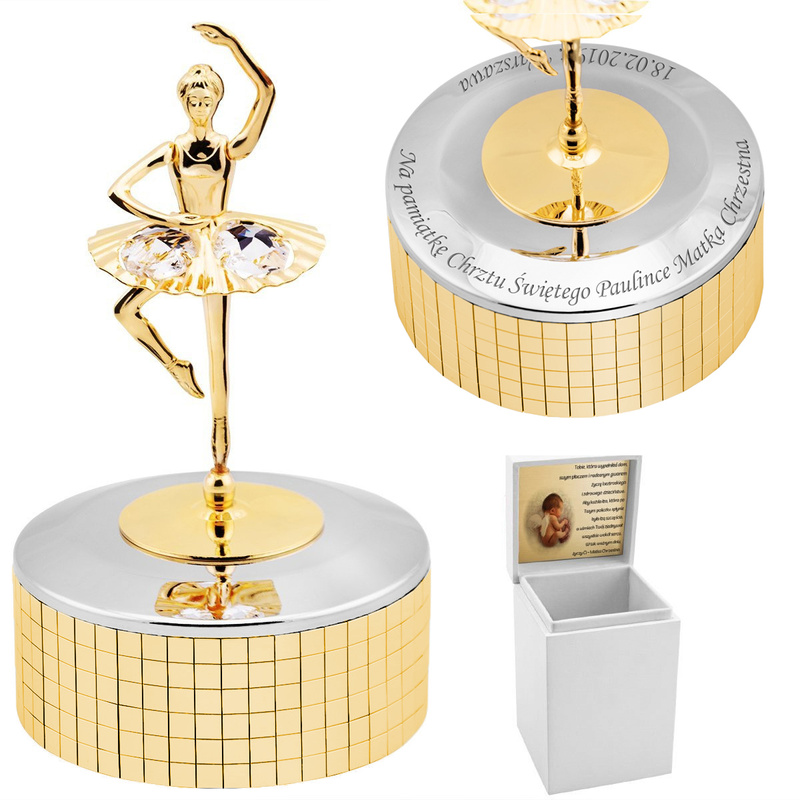 Prześliczna platerowana 24 - karatowym złotem pozytywka baletnica z oryginalnymi kryształami oraz indywidualnym grawerem. Pozytywkę nakręca się od spodu, a ona obraca się wokół własnej osi - gra melodię "It's a small world ". Piękna i niezapomniana pamiątka z okazji chrztu, roczku, ślubu, jubileuszu, a także wyjątkowy element wyposażenia wnętrza.