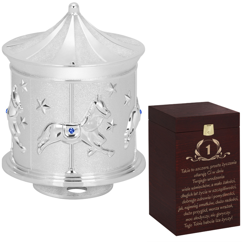 Błękitna Karuzela to przepiękna pozytywka, która zachwyca blaskiem i melodią. Ozdoba, która zawsze będzie przywoływać miłe wspomnienia. Taki upominek stanie się ulubioną pamiątką chrztu, narodzin lub roczku.