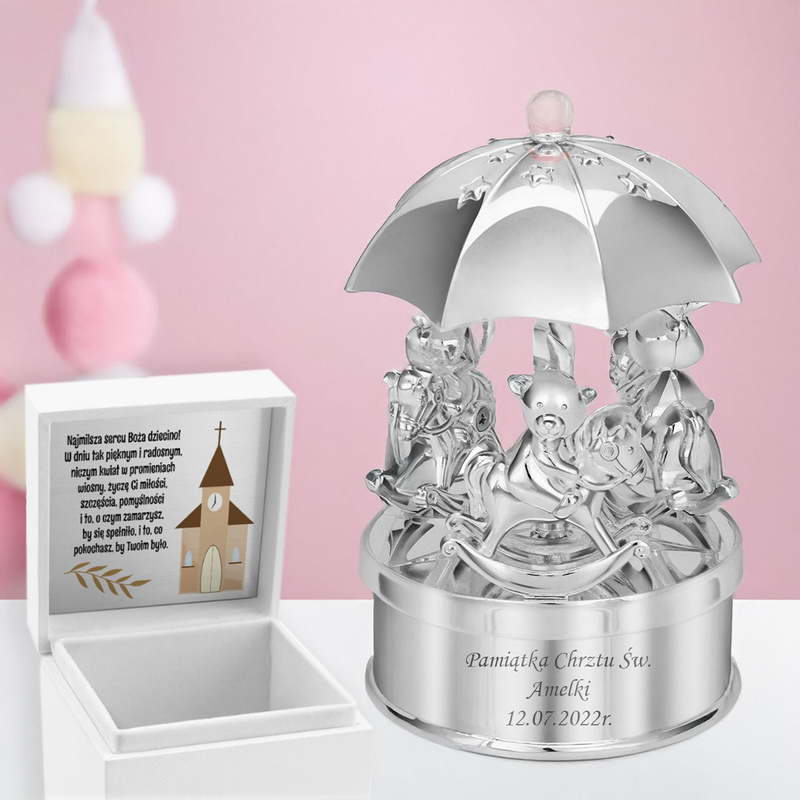 Na podstawie pozytywki możemy wykonać dowolny grawerunek. Tak dopasowana do uroczystości pozytywka, będzie idealną pamiątką chrztu.