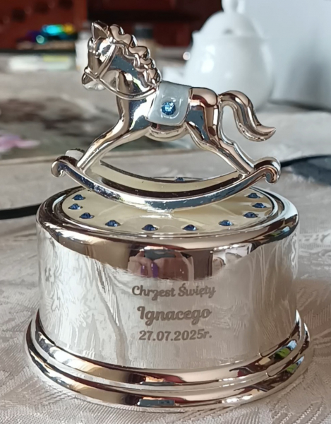 Chrzest Święty, roczek lub narodziny dziecka są wielkim wydarzeniem w życiu małego człowieka przez co staramy się podarować mu upominek, który będzie pamiątką na lata. Delikatna melodia pozytywki potrafi uspokoić każde dziecko bez względu na powód płaczu. Wyjątkowy prezent dla chłopca lub dziewczynki! Produkt wykonany jest z posrebrzanej stali, na górze został umieszczony konik na biegunach, który od razu kojarzy nam się z dzieciństwem. Dodatkowo upominek został ozdobiony błękitnymi kamyczkami, które pięknie mienią się w słońcu.
