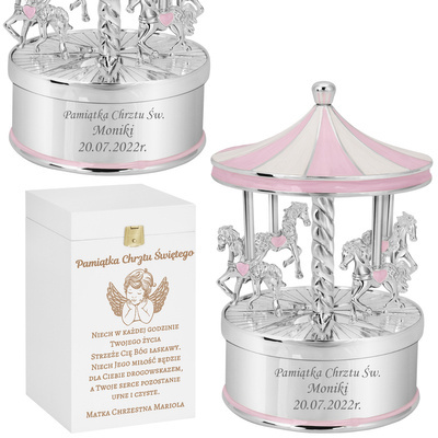 Różowa pozytywka, wykonana została z posrebrzanego metalu. Dodatkowym atutem są pięknie odbijające światło cyrkonie. Przywołuje ona pozytywne skojarzenia z radosnym i beztroskim dzieciństwem. Pozytywka wygrywa znaną melodię, która z pewnością zapadnie dziecku w pamięć i będzie pomagać w wyciszeniu przed snem.