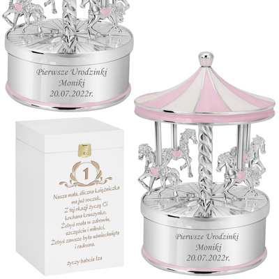 Pozytywka różowa karuzela posrebrzana z grawerem / Prezent na roczek dla dziewczynki.