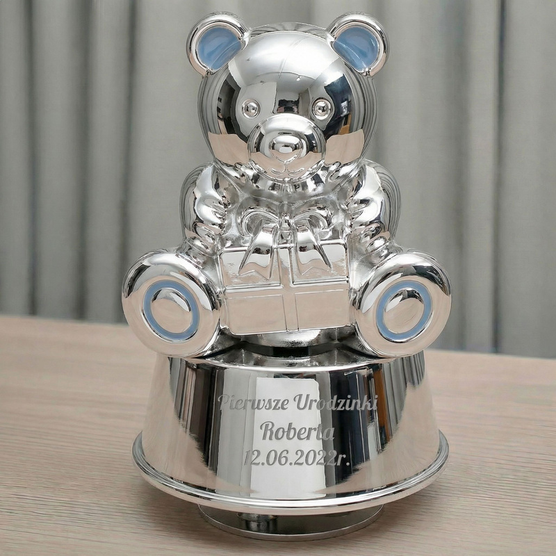 To propozycja dla osób, które chcą podarować coś więcej niż samą ozdobę. Miś z upominkiem jest jednocześnie pozytywką i skarbonką, dlatego może towarzyszyć dziecku w codziennych rytuałach i w nauce odkładania drobnych. Personalizacja nadaje całości indywidualny charakter, a laserowa technika podkreśla precyzję wykonania napisów.