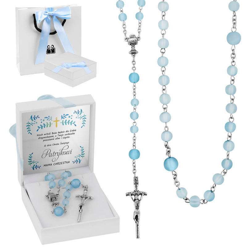 Elegancki różaniec w odcieniach błękitu wykonany z matowych paciorków pięknie prezentuje się i wygodnie leży w dłoni. Trwałe elementy oraz krzyżyk ze stali nierdzewnej zapewniają odporność na codzienne użytkowanie. Zestaw tworzy spójną całość: białe pudełko z kokardą, dopasowana torebka prezentowa oraz metalowa tabliczka z dedykacją wewnątrz opakowania.