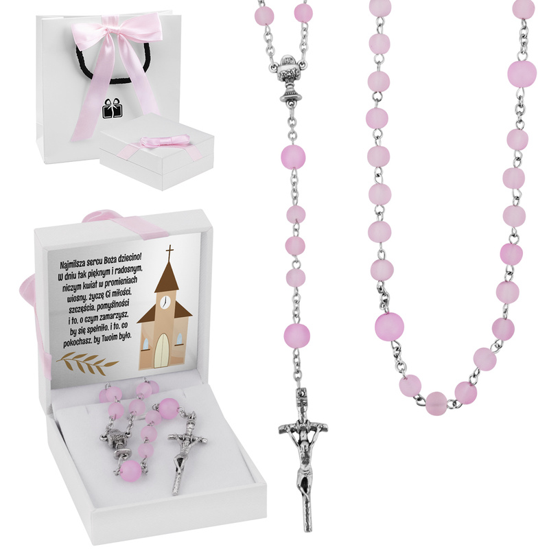 Delikatny, dziewczęcy różaniec z różowymi paciorkami pięknie prezentuje się i wygodnie leży w dłoni. Trwałe elementy oraz krzyżyk ze stali nierdzewnej dodają elegancji i odporności na codzienne użytkowanie. Zestaw jest kompletny: białe pudełko z kokardą, dopasowana torebka oraz metalowa tabliczka z dedykacją tworzą spójną, uroczystą oprawę.