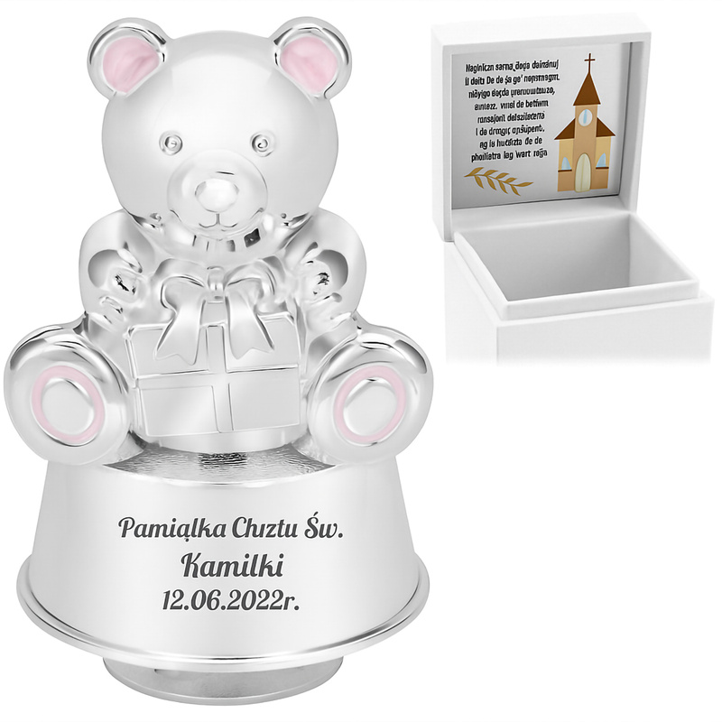 Pozytywka z funkcją skarbonki Miś z prezentem jest rewelacyjnym pomysłem na prezent z okazji chrztu lub roczku. Pięknie odbijająca światło ozdoba wykonana została z wysokiej jakości metalu. Na podstawie pozytywki możemy umieścić dowolny grawerunek. W ten sposób spersonalizowany podarunek nabierze osobistego charakteru.