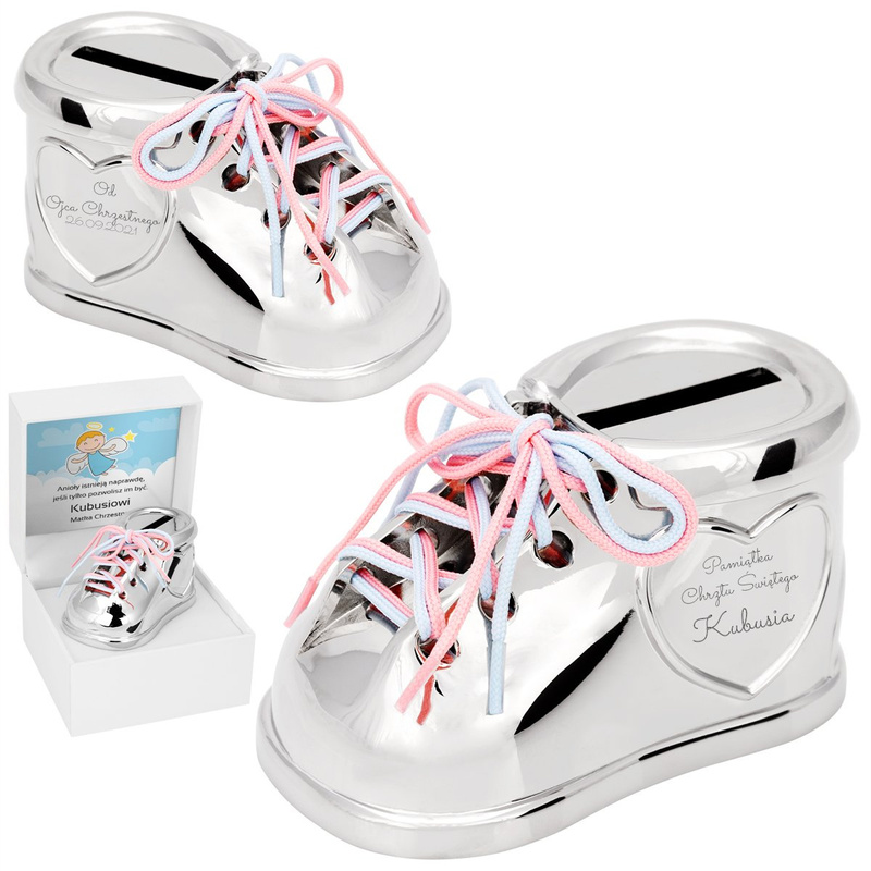 Duże czy małe skarbonki - nie tylko ładnie wyglądają ale spełniają ważną rolę w życiu każdego dziecka. To właśnie z ich pomocą młody człowiek zaczyna rozumieć wartość pieniądza i uczy się oszczędności. Mamy do zaoferowania elegancką skarbonkę w kształcie bucika wykonanej z posrebrzanej stali, zabezpieczonej dodatkowo warstwą ochronną aby nie czerniała. Skarbonka posiada możliwość otworzenia zawartości.