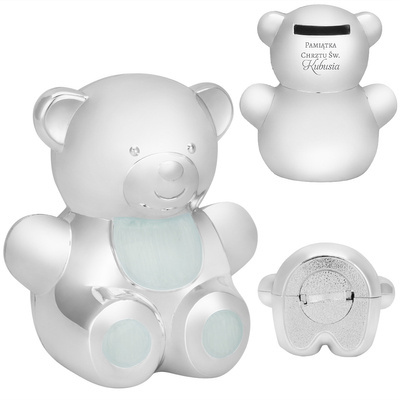 Urocza skarbonka w kształcie misia to idealny prezent na chrzest. Delikatny wygląd z niebieskimi akcentami sprawiają, że skarbonka idealnie wkomponuje się w każdy pokój dziecięcy. Indywidualny grawerunek, który wykonujemy na Państwa zlecenie sprawia, że prezent jest wyjątkowy i niepowtarzalny, co czyni go piękną ozdobą i pamiątką na długie lata. Ze względu na uniwersalny charakter, miś będzie również świetnym prezentem na inne okazje, takie jak urodzinki czy roczek.