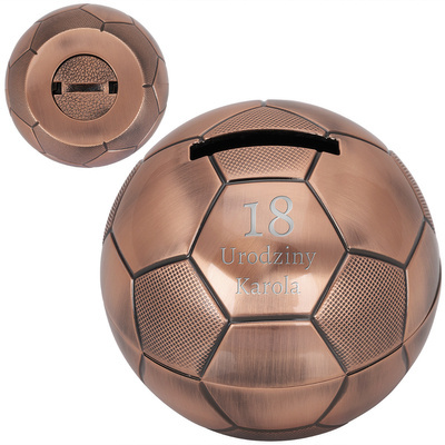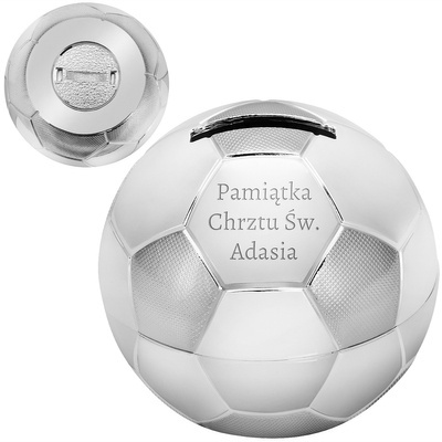 Gratka dla każdego kibica piłki nożnej - małego i większego! Chromowana skarbonka w kształcie piłki nożnej, wspaniale wpisze się w wystrój pokoju małego chłopca jak i nastolatka. Co jednak najważniejsze, da mu możliwość oszczędzania pierwszych pieniążków, tak skrzętnie odkładanych na wielkie marzenia.