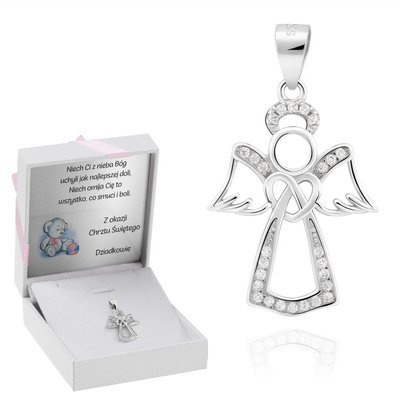 Anioł stróż wykonany z najwyższej jakości srebra próby 925 zdobiony cyrkoniami. Zawieszka wykonana z dbałością o każdy detal. Symbol opieki boskiej, doskonałości, bezpieczeństwa, pokoju i radości. Kształt aniołka jest dość popularną i tradycyjną formą, ale przez zdobienia delikatnymi cyrkoniami nabiera on nowoczesności.
