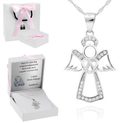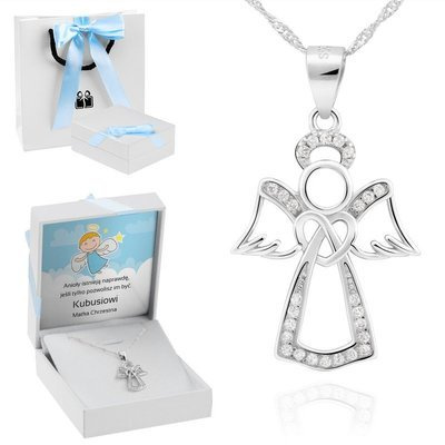Anioł stróż wykonany z najwyższej jakości srebra próby 925 zdobiony cyrkoniami.  Zawieszka wykonana z dbałością o każdy detal. Symbol opieki boskiej, doskonałości, bezpieczeństwa, pokoju i radości. Kształt aniołka jest dość popularną i tradycyjną formą, ale przez zdobienia delikatnymi cyrkoniami nabiera on nowoczesności.