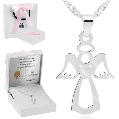 Wisiorek aniołek, wykonany w całości ze srebra próby 925. To piękna biżuteria, z niezwykłą symboliką, którą warto mieć zawsze przy sobie. W komplecie znajduje się także srebrny łańcuszek o splocie singapur, próby srebra 925. Upominek będzie bardzo dobrym prezentem na wszelkiego rodzaju okoliczności takie jak urodziny, Chrzciny, I Komunia Święta i wiele innych tych szczególnych okazji. Twój prezent będzie dodatkowo spersonalizowany dzięki tabliczce dedykacyjnej umieszczonej wewnątrz pudełeczka. Na metalowej tabliczce w kolorze srebrnym mogą Państwo umieścić swój spersonalizowy wiersz, podziękowania, grafikę, a nawet zdjęcie. Całość zapakujemy w ozdobne pudełeczko w kolorze białym z różową kokardką. Będzie to wspaniały podarunek. Będzie to wspaniały podarunek!