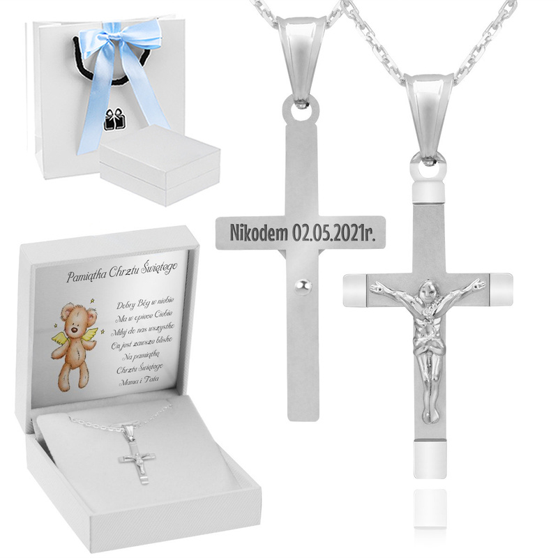 - grawerunek na rewersie krzyżyka np. krótkie imię i data, maksymalnie 20 znaków (łącznie ze spacjami)