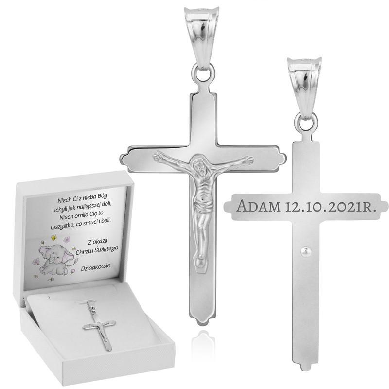 Srebrny, duży krzyżyk z figurą Jezusa. Krzyżyk to jeden z nieodłącznych atrybutów dziecka przystępującego do I Komunii Św. To równie z częsty wybór na prezent z okazji Chrztu Św. lub Bierzmowania. Na zakup krzyżyka dla siebie, decydują się także osoby dorosłe. Nigdy nie jest za późno na rozpoczęcie noszenia na piersi krzyżyka.