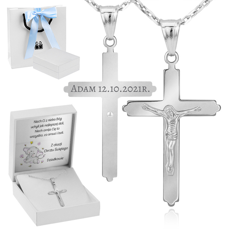 Krzyżyk jest w komplecie ze srebrnym łańcuszkiem (ankier). Oba przedmioty umieścimy w białym pudełku. W jego wnętrzu dodamy tabliczkę z osobistą dedykacją klienta. Mogą to być życzenia, słowa modlitwy, pieśni dopełnione grafiką itp. Komplet zapakujemy do torebki prezentowej ze wstążką. Tak przygotowany prezent wygląda niezwykle elegancko i robi dobre wrażenie.