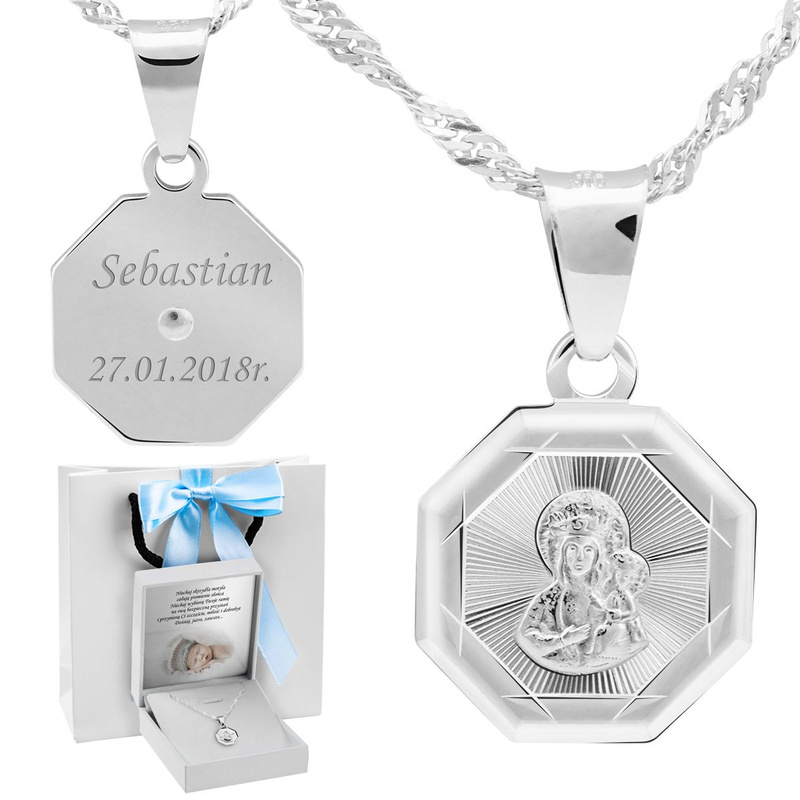 Proponujemy Państwu prześliczny medalik z wizerunkiem Matki Boskiej Częstochowskiej w kształcie ośmiokąta . Medalik został wykonany najwyższej jakości srebra próby 925. Wykonany jest ręcznie z niesamowitą dbałością o detale. Posiada cechę Urzędu probierczego. Do zestawu dołączamy również łańcuszek.