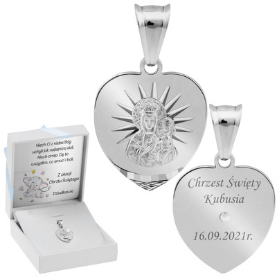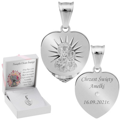 Duży, srebrny medalik w kształcie serca z wizerunkiem Matki Boskiej Częstochowskiej. Idealny dla dziecka przystępującego do I Komunii Św. Sprawdzi się także jako prezent na Chrzest Św. i Bierzmowanie. Medalik jest cennym przedmiotem, który zyskuje na wartości sentymentalnej z upływem lat. Ze względu na swój religijny charakter, często jest noszony niezmiennie przez całe życie.