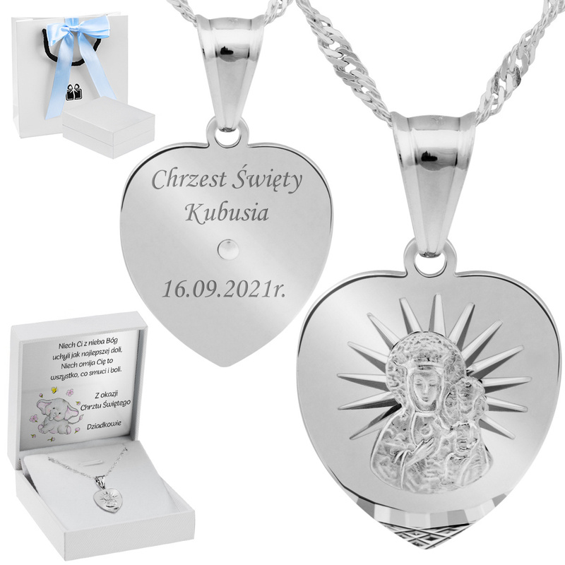 Duży, srebrny medalik w kształcie serca z wizerunkiem Matki Boskiej Częstochowskiej. Idealny dla dziecka przystępującego do I Komunii Św. Sprawdzi się także jako prezent na Chrzest Św. i Bierzmowanie. Medalik jest cennym przedmiotem, który zyskuje na wartości sentymentalnej z upływem lat. Ze względu na swój religijny charakter, często jest noszony niezmiennie przez całe życie.