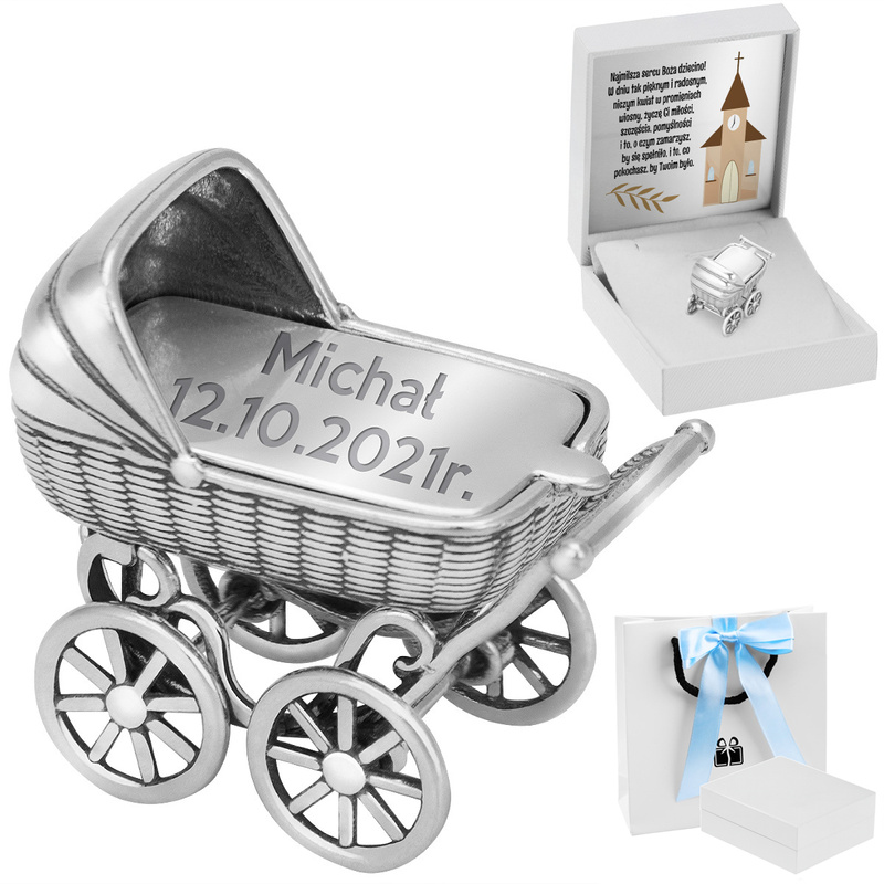 Wyjątkowa pamiątka z okazji Chrztu Św. lub Roczku. Prezentujemy uroczy, wykonany z największą skrupulatnością, maleńki wózeczek ze srebra. Pięknie odzwierciedla wzór prawdziwego wózka dziecięcego w stylu retro. Wózeczek posiada ruchome koła i "przykrycie", na którym można wykonać indywidualny grawerunek na pamiątkę. Wózek jest również puzderkiem, które może skryć niewielkie skarby, takie jak pierwszy ząbek lub pukiel włosów malucha.